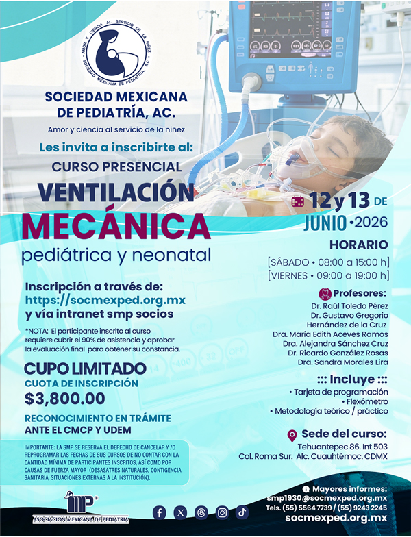 El personal administrativo y la Mesa Directiva 2025-2026 nos esforzaremos por brindarles una atención de calidad y un espacio de constante crecimiento profesional. Aprovechamos esta oportunidad para invitarlos a participar en la 13ª Cumbre Pediátrica de la Sociedad Mexicana de Pediatría, que se llevará a cabo los días 23, 24 y 25 de septiembre del 2026. Este evento será una gran oportunidad para aprender, compartir experiencias y fortalecer nuestra comunidad. Gracias por su confianza y compromiso con nuestra sociedad. Los invito a explorar esta plataforma y a seguir participando activamente en nuestras iniciativas. Juntos, continuaremos avanzando en la noble misión de velar por la salud y bienestar de nuestros niños.
